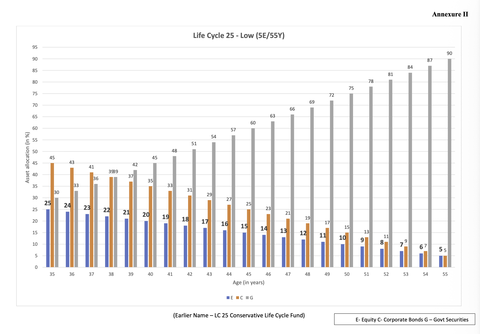 In this plan, a maximum of 25% of your money is invested in equity up to the age of 35. The larger portion of your savings goes into government bonds and corporate bonds, which are considered safer investment options.