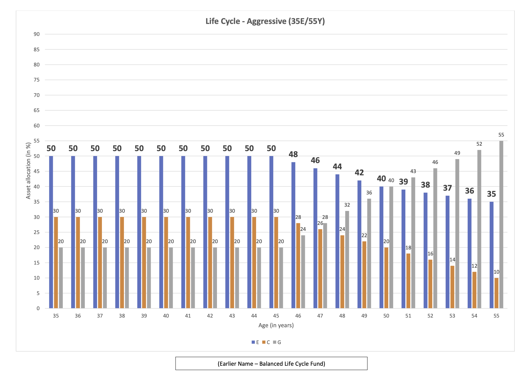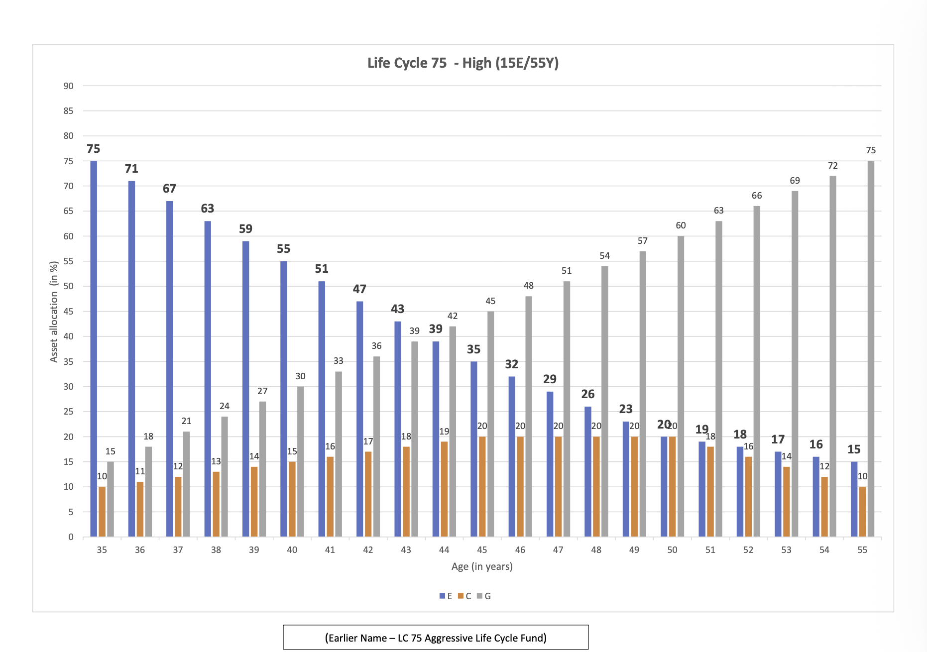 Until the age of 35 years, the equity allocation remains at its highest level. After that, it is gradually reduced based on your age ( Fall to 10% at the age of 55 ). Your money is slowly moved to safer investments like government securities and bonds as you grow older, automatically and without any effort from your side.